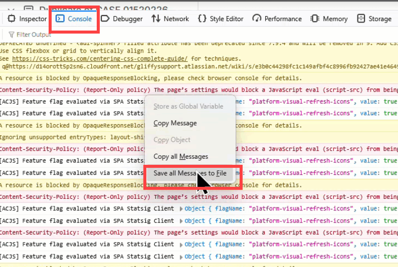 To capture a console log, click the Console tab, right-click the mouse and select Save all Messages to File: