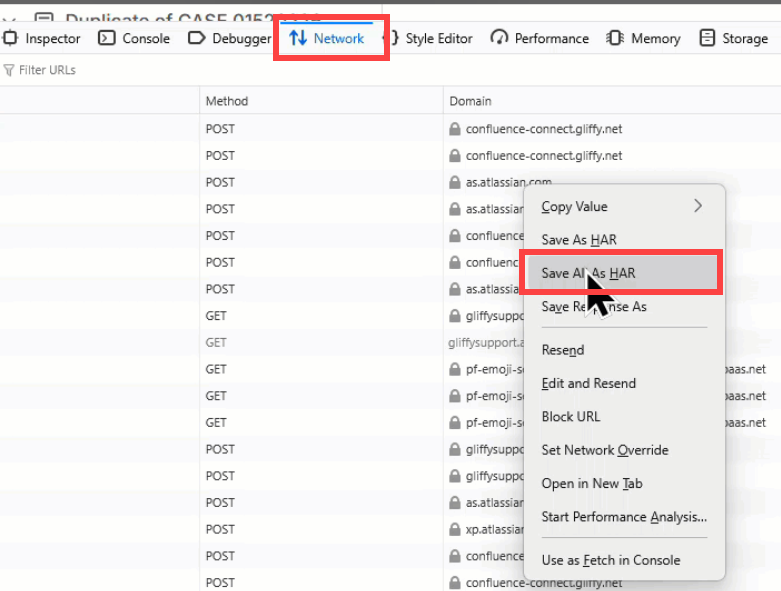 To capture a HAR file, click the Network tab, right-click the mouse and select Save All As HAR: