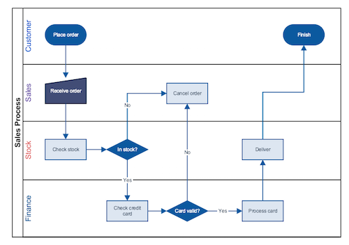 In a swimlane diagram, processes are split into distinct channels (or lanes in a swimming pool) according to whose responsibility they are. This allows each person (or group of people, such as a business department) to quickly and easily see what they’re required to accomplish. Because the lanes are arranged side-by-side, you can organize events in the process in sequence and connect them with arrows so that multiple processes come together to form a whole.