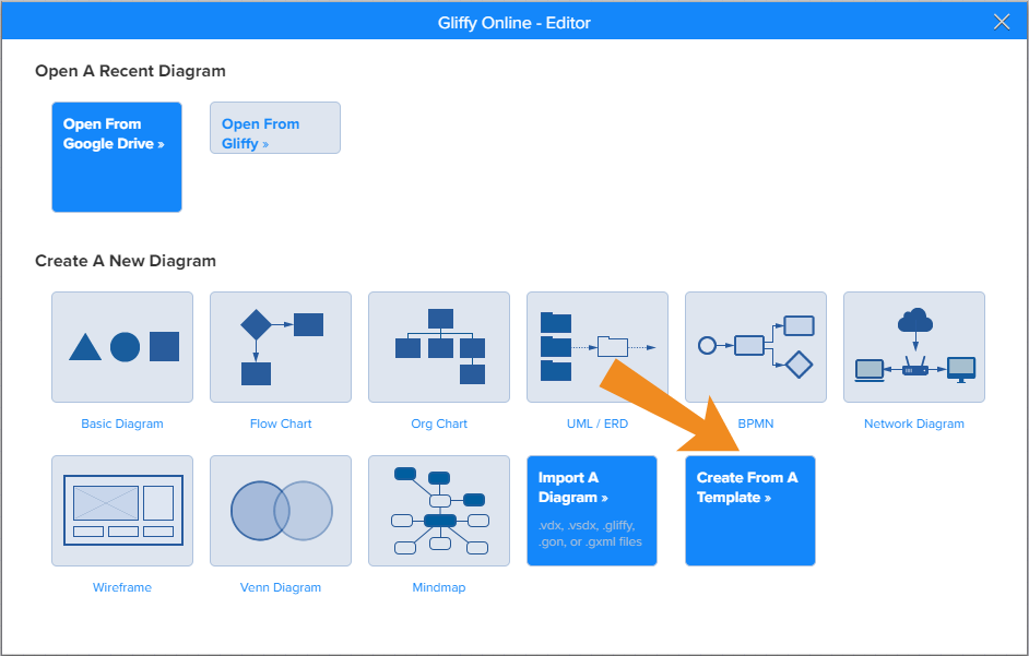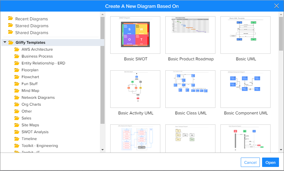You can create a new diagram based on one of the many Gliffy templates (see Diagram types). The type of diagram that you choose determines the shape libraries that are visible in the Gliffy editor. For example, if you create a diagram from a wirefrema template, the wireframe shape libraries are loaded by default in the editor.