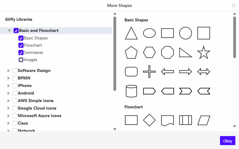 If you do not see the shape library you want, you can add additional shape libraries to your editor. The Images library, within the Basic and Flowchart category enables you to add your own images to your diagrams.